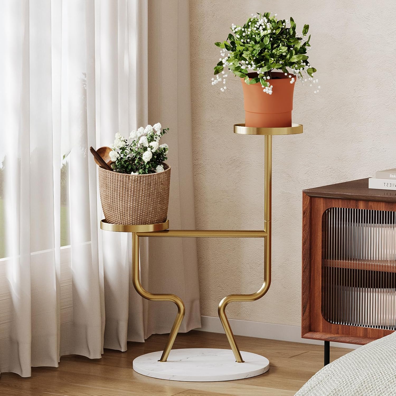 2-Tier Flower Holder with Marble Base, Tall Tiered Planter Shelf for Living Room, Balcony, Office, Stable Iron Plant Display Rack (Golden).